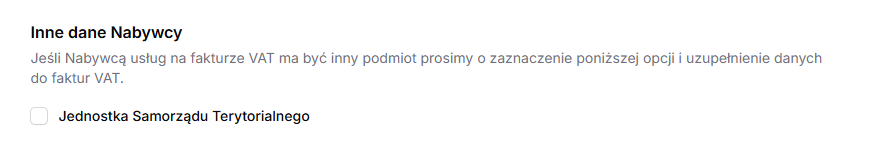 4. W sekcji „Inne dane Nabywcy” zaznacz opcję: Jednostka Samorządu Terytorialnego