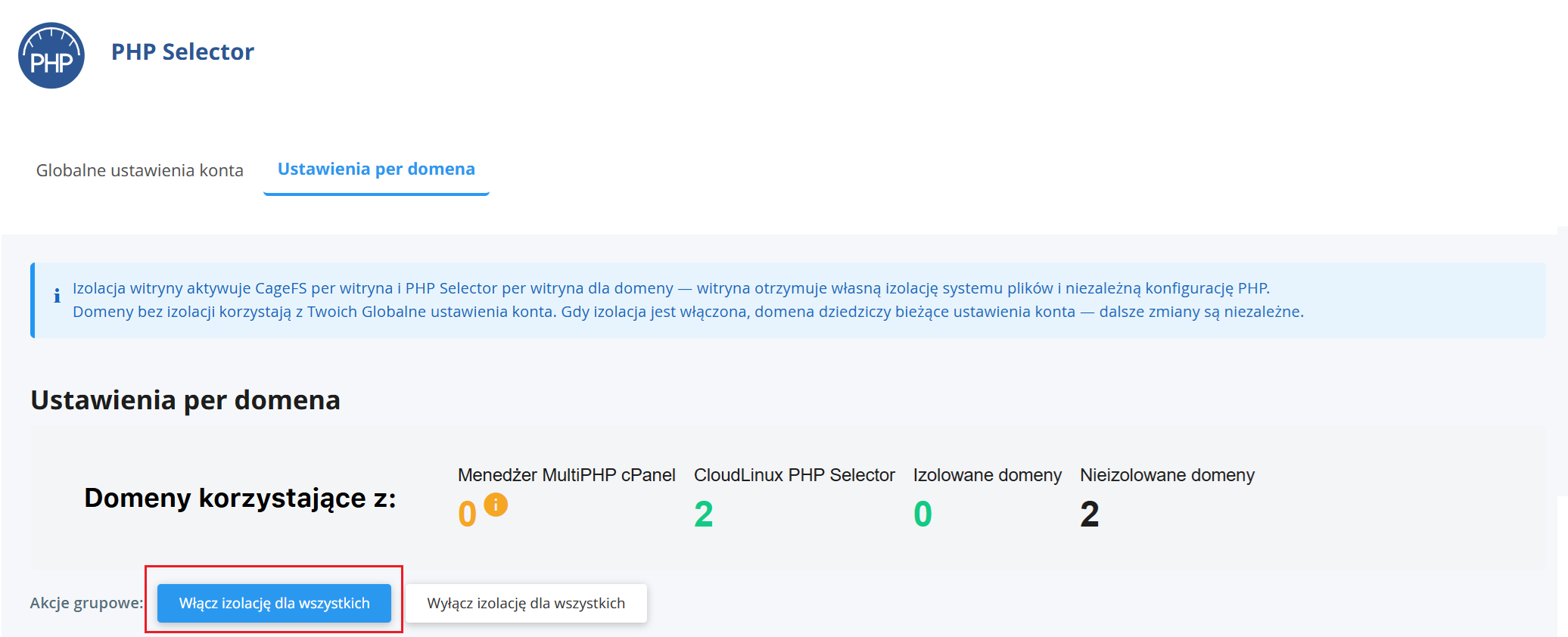 - Pojawi się lista domen dodanych do Twojego konta hostingowego. Możesz aktywować globalnie izolację dla wszystkich domen wybierając opcję: Włącz izolację dla wszystkich