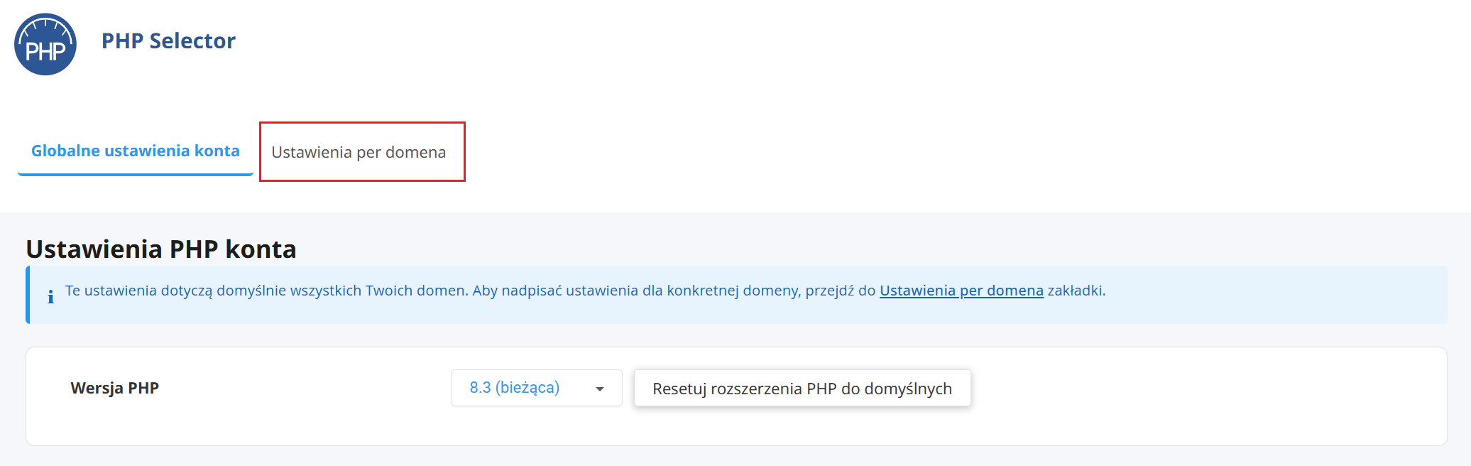 Izolacja per domena jest ściśle powiązana z funkcją wyboru wersji PHP per domena, która pozwala przypisać każdej izolowanej witrynie niezależną wersję PHP oraz zestaw rozszerzeń. To szczególnie przydatne, gdy na jednym koncie hostingujesz aplikacje wymagające różnych wersji PHP – na przykład starszego WordPressa wymagającego PHP 7.4 obok nowoczesnej aplikacji działającej na PHP 8.3.