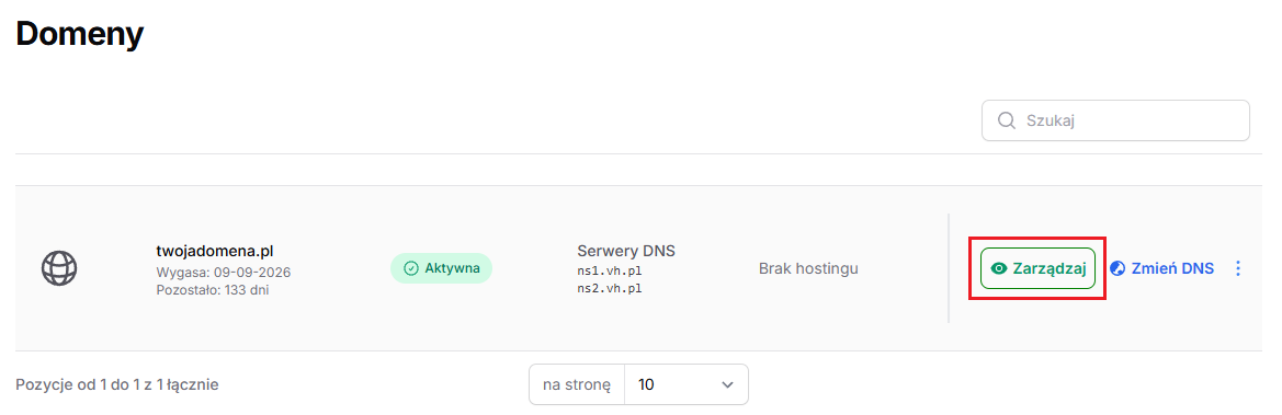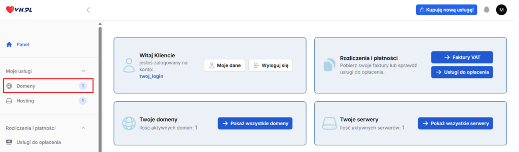 Jeśli Twoja domena jest utrzymywana bezpośrednio w VH.PL, kod AuthInfo pobierzesz samodzielnie z panelu klienta — bez konieczności składania wniosku. Wystarczy wykonać kilka prostych kroków:
