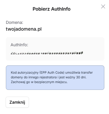 Jeśli przycisk „Pobierz AuthInfo” nie jest widoczny w panelu lub masz wątpliwości, skontaktuj się z naszym Biurem Obsługi Klienta: bok@vh.pl. Może to oznaczać, że Twoja domena jest obsługiwana przez zewnętrznego Rejestratora.