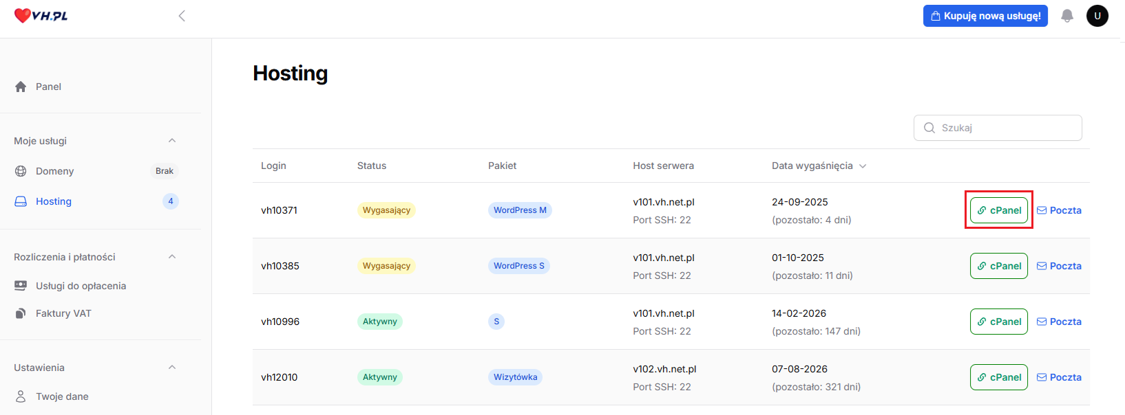 - Pojawi się lista posiadanych kont hostingowych. Przy wybranym hostingu kliknij przycisk „cPanel” aby automatycznie zalogować się do panelu administracyjnego hostingu.